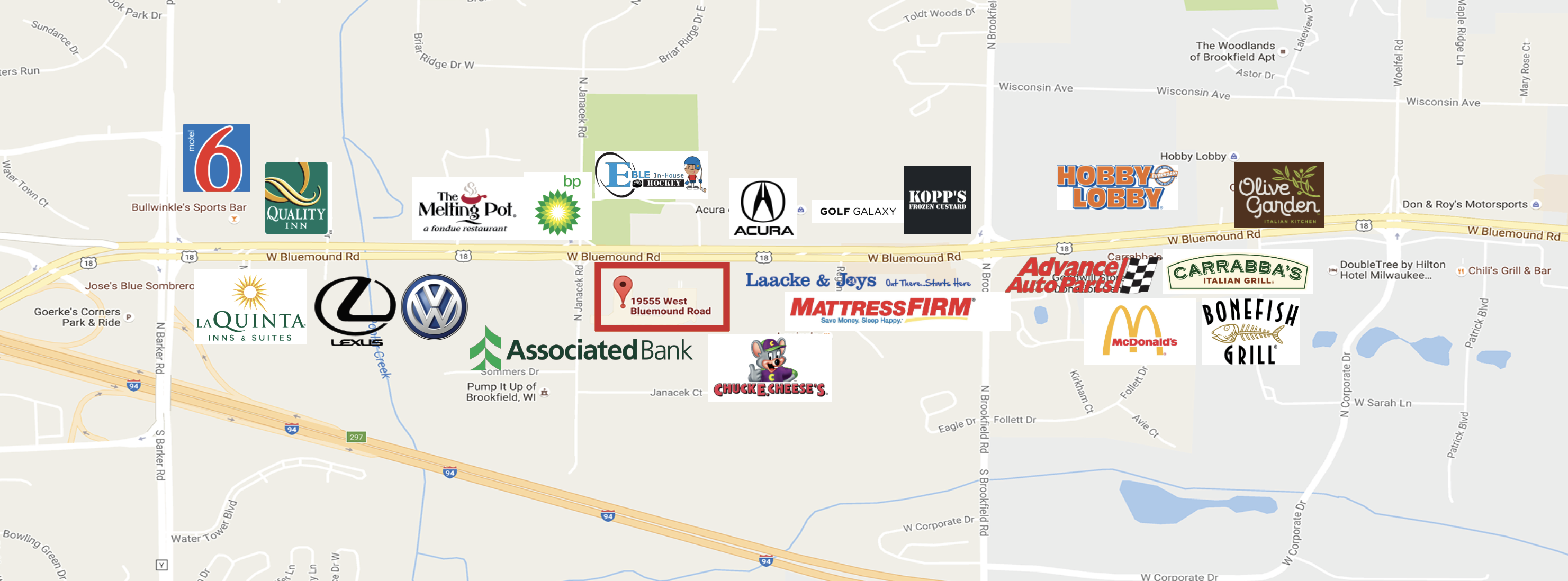 From Milwaukee: Take I-94 West for 12 miles to Exit 297. Turn right on Bluemound Road. Continue .7 miles to Bluemound Plaza (on your right).